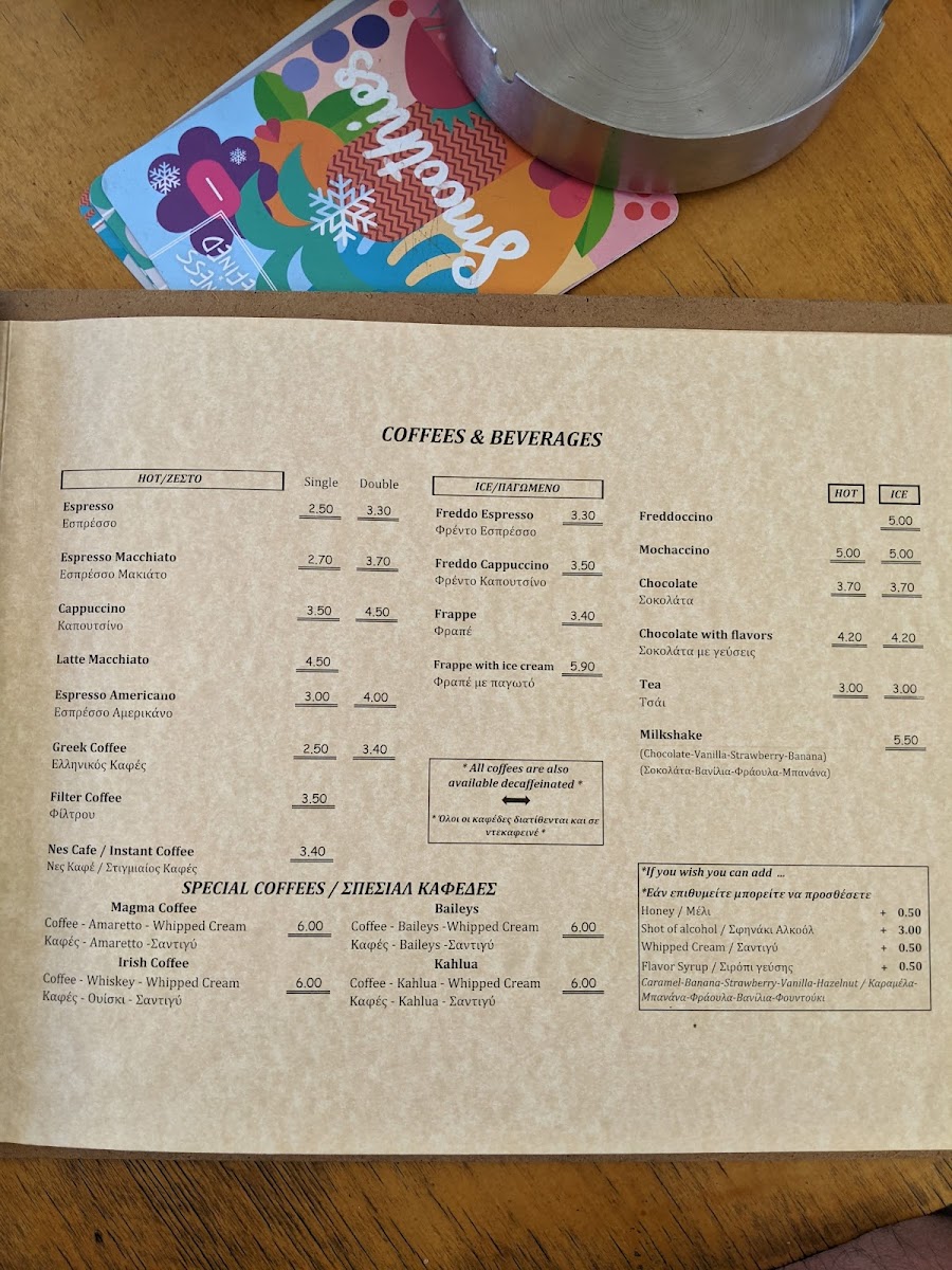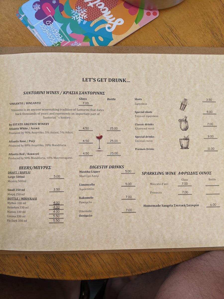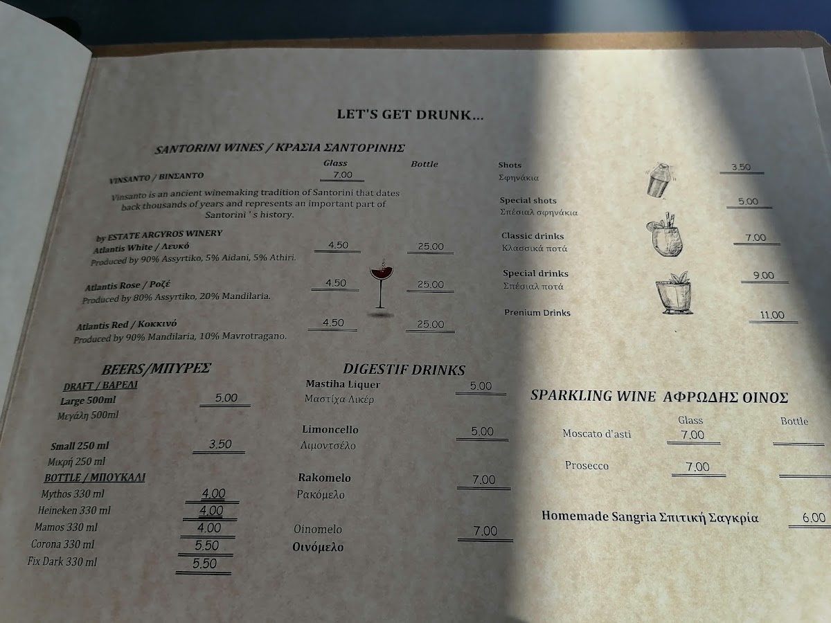 Ambiance: Enjoy a cozy vibe, whether indoors or in the beautifully arranged outdoor area, perfect for soaking in the Santorini charm.